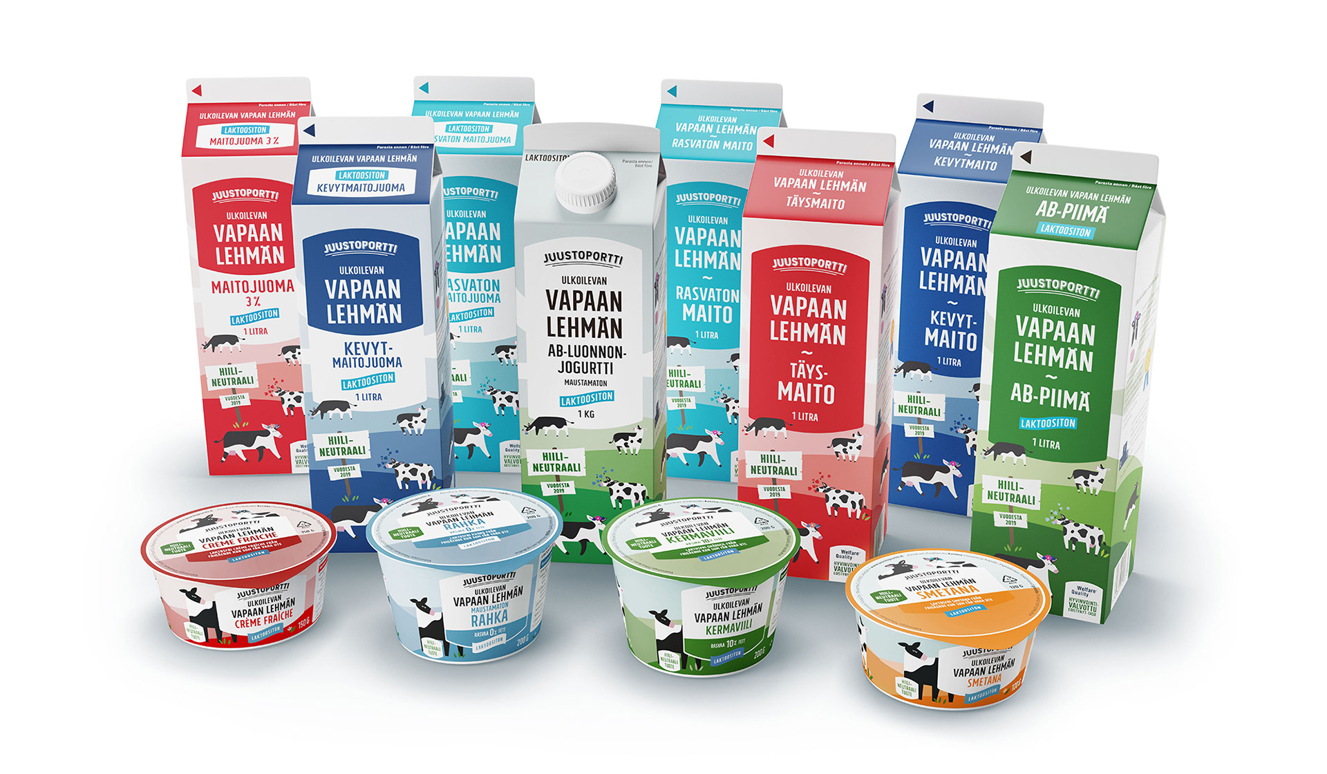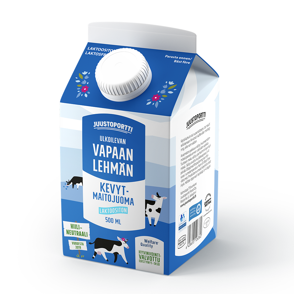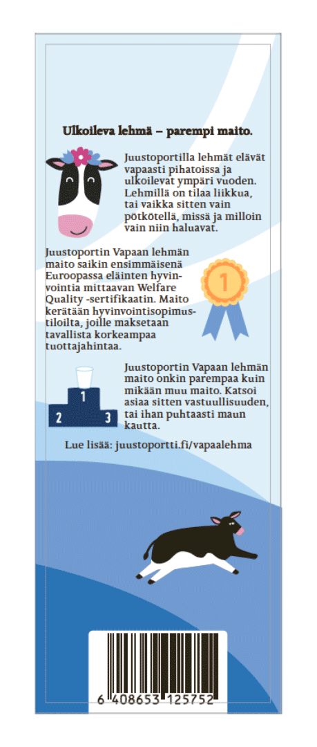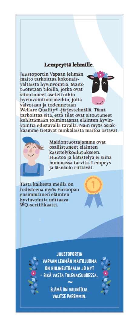 Layout Design and prepress for Juustoportti 'Vapaan lehmän' milk products during internship in Folk Finland. Also created side panel illustrations for milk packages.